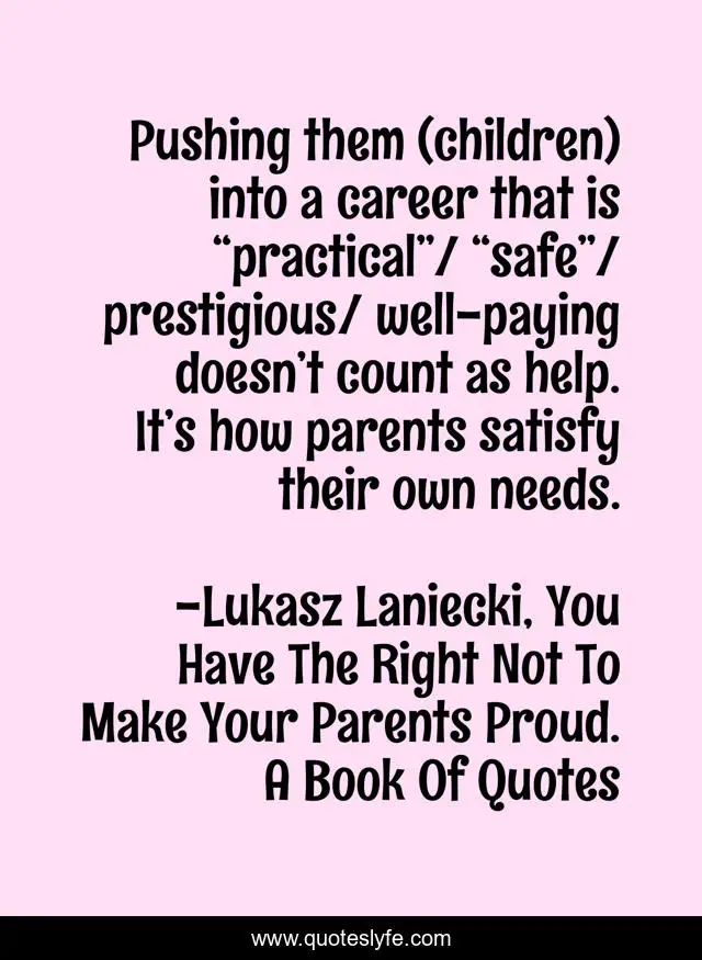 This page presents the quote "Pushing them (children) into a career that is “practical”/ “safe”/ prestigious/ well-paying doesn’t count as help. It’s how parents satisfy their own needs.". Author of this quote is Lukasz Laniecki, You Have The Right Not To Make Your Parents Proud. A Book Of Quotes. This quote is about life, career-advice, family, controlling-parents, parents, careers, life-advice, family-relationships, career-choices,.