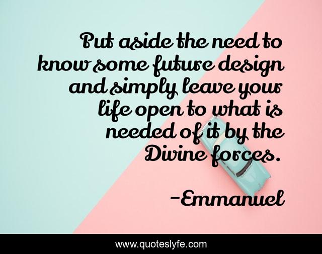 This page presents the quote "Put aside the need to know some future design and simply leave your life open to what is needed of it by the Divine forces.". Author of this quote is Emmanuel. .