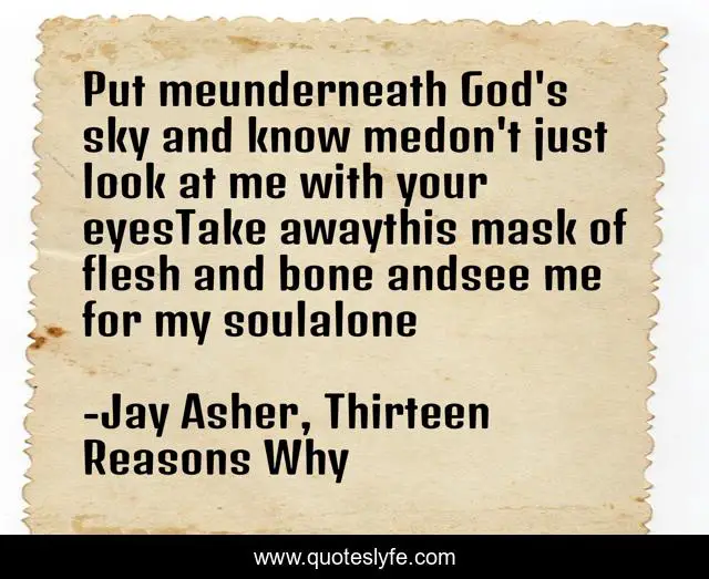 This page presents the quote "Put meunderneath God's sky and know medon't just look at me with your eyesTake awaythis mask of flesh and bone andsee me for my soulalone". Author of this quote is Jay Asher, Thirteen Reasons Why. This quote is about beautiful, sad,.