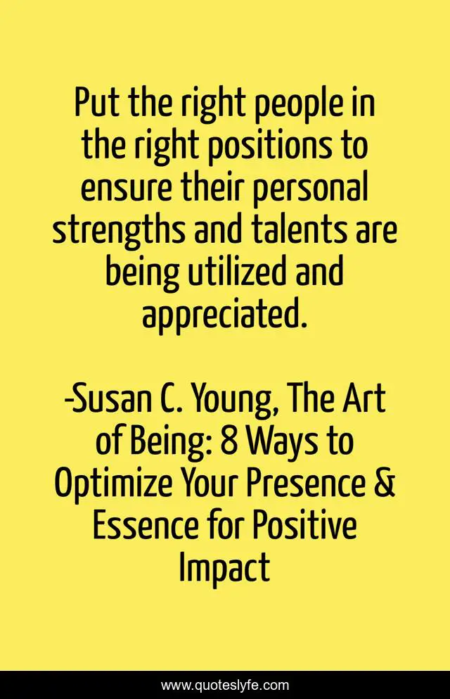 This page presents the quote "Put the right people in the right positions to ensure their personal strengths and talents are being utilized and appreciated.". Author of this quote is Susan C. Young, The Art of Being: 8 Ways to Optimize Your Presence & Essence for Positive Impact. This quote is about confidence, susan-young, relationship, communication-skills, passionate-living, communication, first-impressions, authenticity, integrity,.