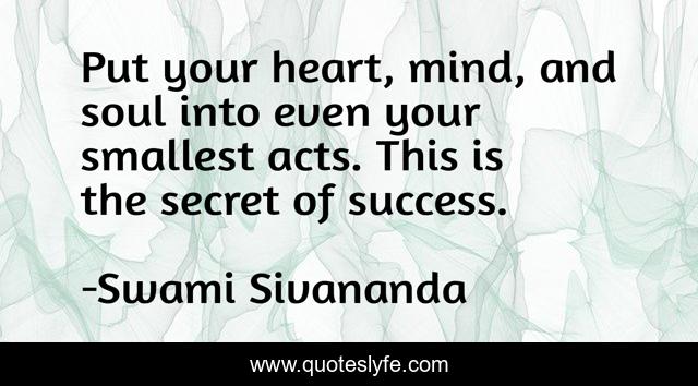 This page presents the quote "Put your heart, mind, and soul into even your smallest acts. This is the secret of success.". Author of this quote is Swami Sivananda. This quote is about heart, soul, success,.