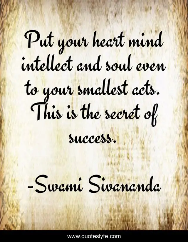 This page presents the quote "Put your heart mind intellect and soul even to your smallest acts. This is the secret of success.". Author of this quote is Swami Sivananda. .