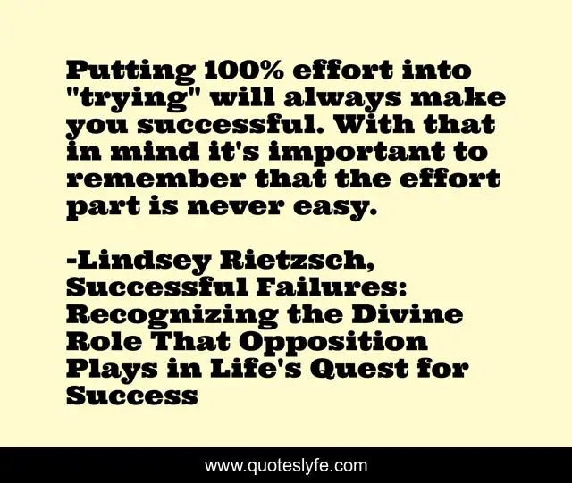 "Lindsey Rietzsch, Successful Failures: Recognizing the Divine Role That Opposition Plays in Life's Quest for Success Quotes." Quoteslyfe.com, 2025. Fri. 05 Dec. 2025. <https://www.quoteslyfe.com/quote/Putting-100-effort-into-trying-will-always-83795>.
