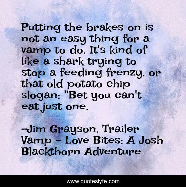 This page presents the quote "Putting the brakes on is not an easy thing for a vamp to do. It's kind of like a shark trying to stop a feeding frenzy, or that old potato chip slogan: "Bet you can't eat just one.". Author of this quote is Jim Grayson, Trailer Vamp - Love Bites: A Josh Blackthorn Adventure. This quote is about humorous, vampire,.