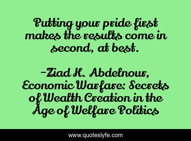 This page presents the quote "Putting your pride first makes the results come in second, at best.". Author of this quote is Ziad K. Abdelnour, Economic Warfare: Secrets of Wealth Creation in the Age of Welfare Politics. .