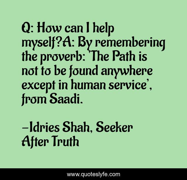 This page presents the quote "Q: How can I help myself?A: By remembering the proverb: ‘The Path is not to be found anywhere except in human service’, from Saadi.". Author of this quote is Idries Shah, Seeker After Truth. This quote is about saadi, sufis, sufism, wisdom,.