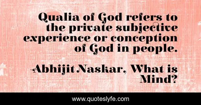 This page presents the quote "Qualia of God refers to the private subjective experience or conception of God in people.". Author of this quote is Abhijit Naskar, What is Mind?. This quote is about qualia, god, science-and-religion, truth, wisdom, religion, words-of-wisdom, neuroscience, neurotheology,.