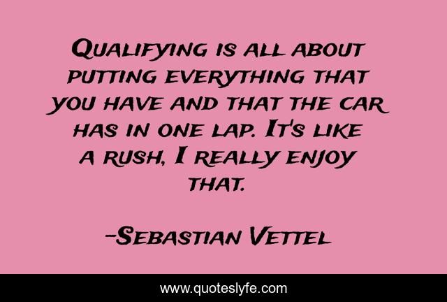 This page presents the quote "Qualifying is all about putting everything that you have and that the car has in one lap. It's like a rush, I really enjoy that.". Author of this quote is Sebastian Vettel. This quote is about enjoy, everything,.