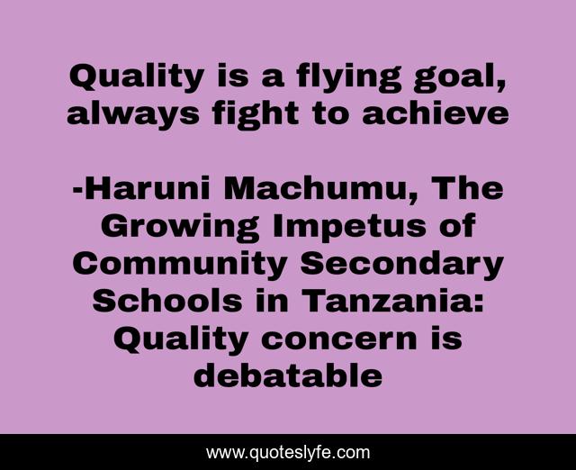 This page presents the quote "Quality is a flying goal, always fight to achieve". Author of this quote is Haruni Machumu, The Growing Impetus of Community Secondary Schools in Tanzania: Quality concern is debatable. .