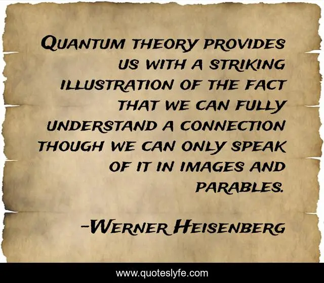 This page presents the quote "Quantum theory provides us with a striking illustration of the fact that we can fully understand a connection though we can only speak of it in images and parables.". Author of this quote is Werner Heisenberg. This quote is about models, metaphor, physics, quantum-mechanics,.