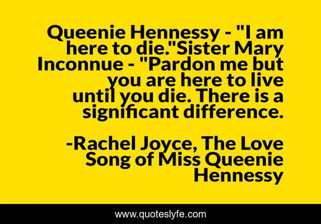 This page presents the quote "Queenie Hennessy - "I am here to die."Sister Mary Inconnue - "Pardon me but you are here to live until you die. There is a significant difference.". Author of this quote is Rachel Joyce, The Love Song of Miss Queenie Hennessy. This quote is about death, love, dying, hospice, pilgrimage, affection,.
