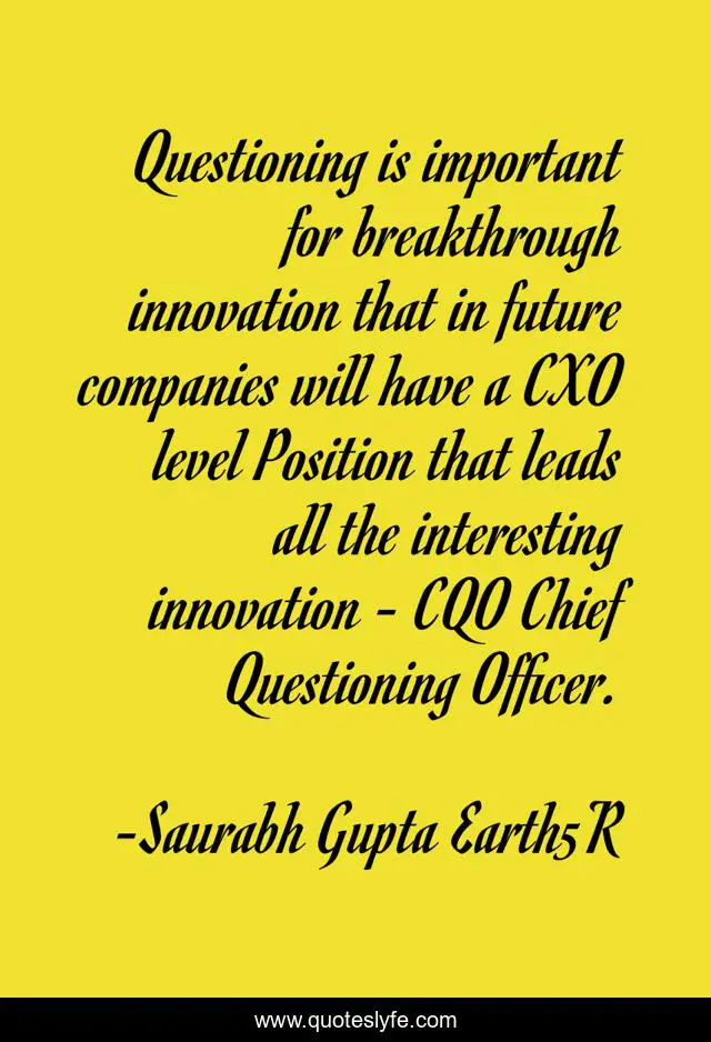 This page presents the quote "Questioning is important for breakthrough innovation that in future companies will have a CXO level Position that leads all the interesting innovation - CQO Chief Questioning Officer.". Author of this quote is Saurabh Gupta Earth5R. This quote is about daily-inspirational, inspirational, entrepreneurship, smart-people, questions, innovation, workplace-wisdom, enthusiasm, smart,.