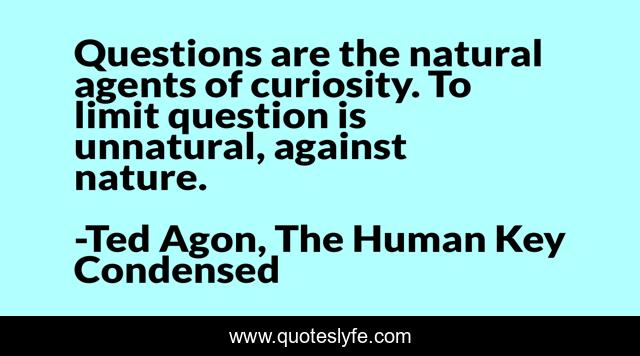 This page presents the quote "Questions are the natural agents of curiosity. To limit question is unnatural, against nature.". Author of this quote is Ted Agon, The Human Key Condensed. This quote is about thinking, learning, communicating,.