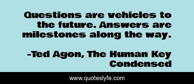 "Ted Agon, The Human Key Condensed Quotes." Quoteslyfe.com, 2025. Sun. 07 Dec. 2025. <https://www.quoteslyfe.com/quote/Questions-are-vehicles-to-the-future-Answers-116832>.