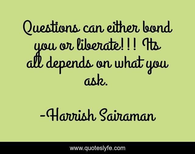 This page presents the quote "Questions can either bond you or liberate!!! Its all depends on what you ask.". Author of this quote is Harrish Sairaman. This quote is about confidence, positive, motivational, optimistic, inspirational, enthusiasm,.