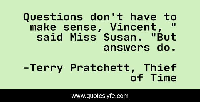 This page presents the quote "Questions don't have to make sense, Vincent, " said Miss Susan. "But answers do.". Author of this quote is Terry Pratchett, Thief of Time. This quote is about stupid-questions, answers, logic,.