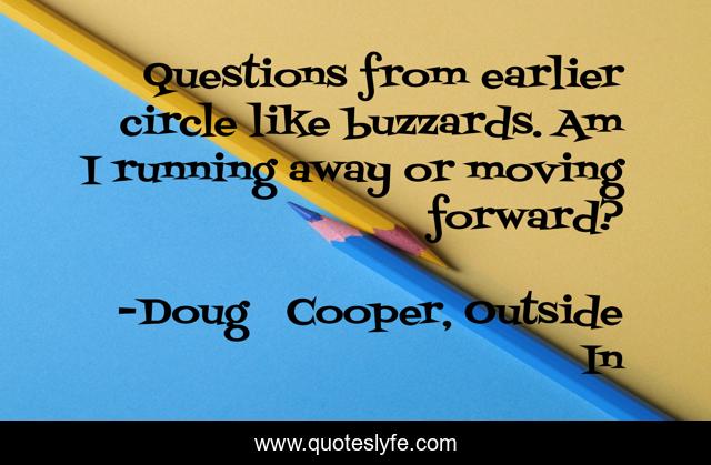 This page presents the quote "Questions from earlier circle like buzzards. Am I running away or moving forward?". Author of this quote is Doug Cooper, Outside In. This quote is about moving-forward, buzzards, running-away, questions, outside-in, identity,.