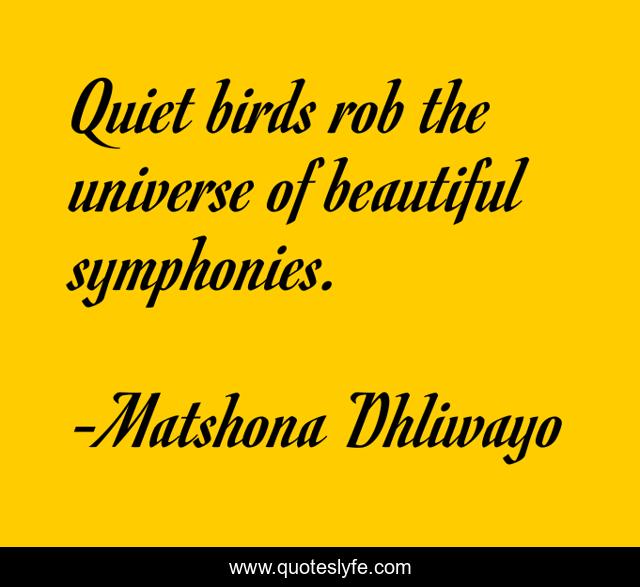 "Matshona Dhliwayo Quotes." Quoteslyfe.com, 2025. Sun. 07 Dec. 2025. <https://www.quoteslyfe.com/quote/Quiet-birds-rob-the-universe-of-beautiful-83526>.