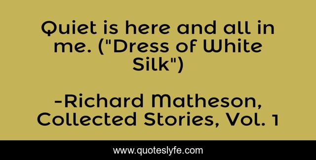 This page presents the quote "Quiet is here and all in me. ("Dress of White Silk")". Author of this quote is Richard Matheson, Collected Stories, Vol. 1. This quote is about quiet, silence,.
