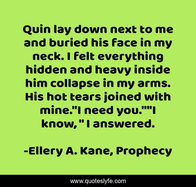 This page presents the quote "Quin lay down next to me and buried his face in my neck. I felt everything hidden and heavy inside him collapse in my arms. His hot tears joined with mine."I need you.""I know, " I answered.". Author of this quote is Ellery A. Kane, Prophecy. This quote is about love, relationship, affection,.
