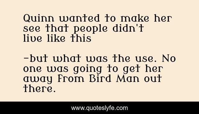 This page presents the quote "Quinn wanted to make her see that people didn't live like this". Author of this quote is but what was the use. No one was going to get her away from Bird Man out there.. .