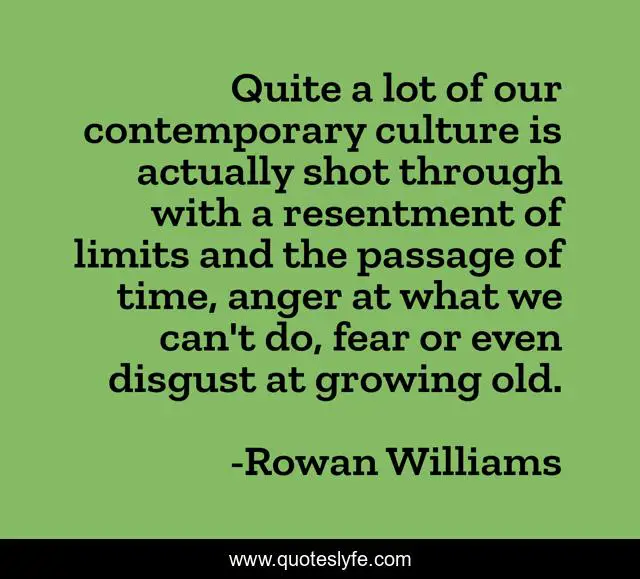This page presents the quote "Quite a lot of our contemporary culture is actually shot through with a resentment of limits and the passage of time, anger at what we can't do, fear or even disgust at growing old.". Author of this quote is Rowan Williams. This quote is about culture, fear, time,.