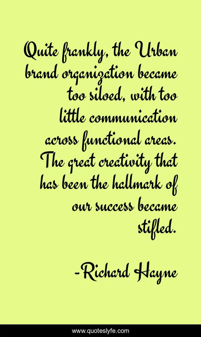 This page presents the quote "Quite frankly, the Urban brand organization became too siloed, with too little communication across functional areas. The great creativity that has been the hallmark of our success became stifled.". Author of this quote is Richard Hayne. This quote is about great, creativity, success,.