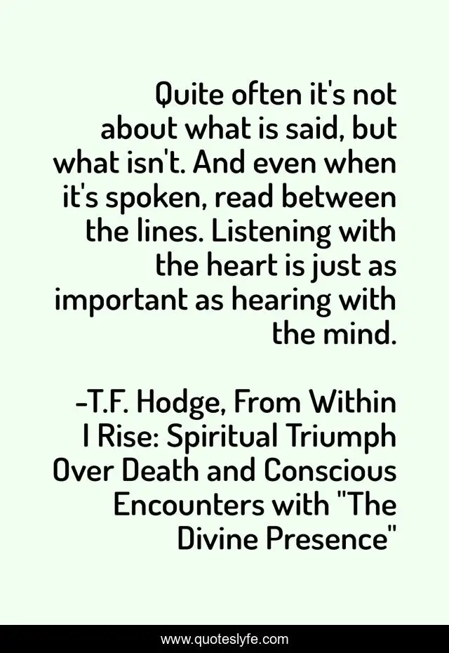 This page presents the quote "Quite often it's not about what is said, but what isn't. And even when it's spoken, read between the lines. Listening with the heart is just as important as hearing with the mind.". Author of this quote is T.F. Hodge, From Within I Rise: Spiritual Triumph Over Death and Conscious Encounters with "The Divine Presence". This quote is about heart, perception, attention, mind, focus, hearing, silence, listening, speaking,.