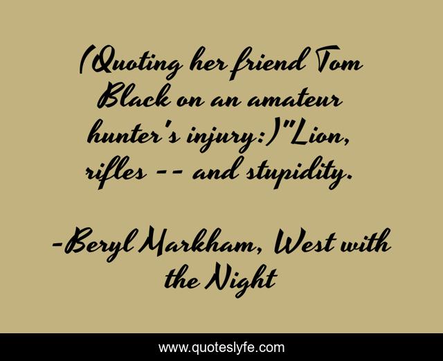 This page presents the quote "(Quoting her friend Tom Black on an amateur hunter's injury:)"Lion, rifles -- and stupidity.". Author of this quote is Beryl Markham, West with the Night. This quote is about stupidity, lions, hunting,.