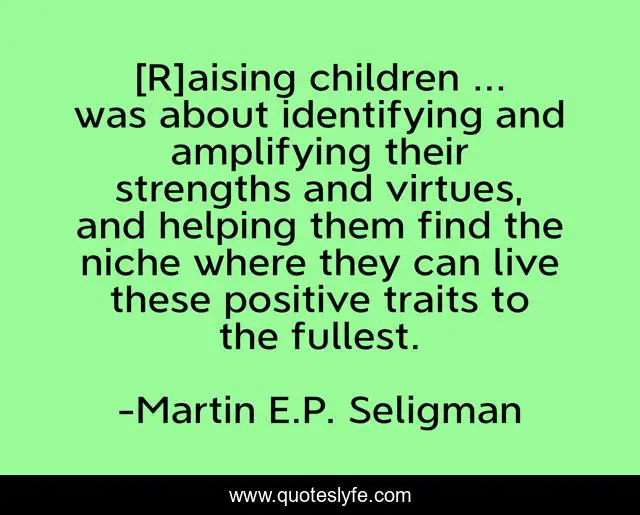 This page presents the quote "[R]aising children ... was about identifying and amplifying their strengths and virtues, and helping them find the niche where they can live these positive traits to the fullest.". Author of this quote is Martin E.P. Seligman. .