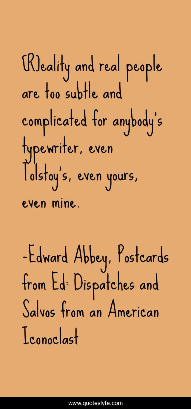 This page presents the quote "[R]eality and real people are too subtle and complicated for anybody's typewriter, even Tolstoy's, even yours, even mine.". Author of this quote is Edward Abbey, Postcards from Ed: Dispatches and Salvos from an American Iconoclast. This quote is about reality, writing,.