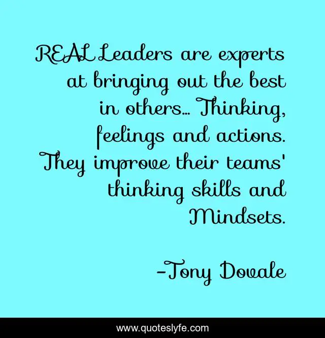 This page presents the quote "REAL Leaders are experts at bringing out the best in others... Thinking, feelings and actions. They improve their teams' thinking skills and Mindsets.". Author of this quote is Tony Dovale. This quote is about mindsets, optimism, performane, organisational-culture, tony-dovale, attitudes, leadership, values, optimisation-hogh-performance,.