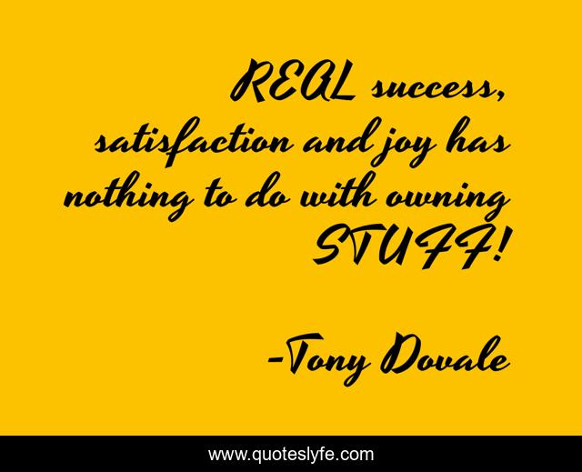 This page presents the quote "REAL success, satisfaction and joy has nothing to do with owning STUFF!". Author of this quote is Tony Dovale. This quote is about courageous-mindsets, swift-success, creativity, leadership, innovation, lifemasters, revolutionary-workplace, consciously-constructive,.