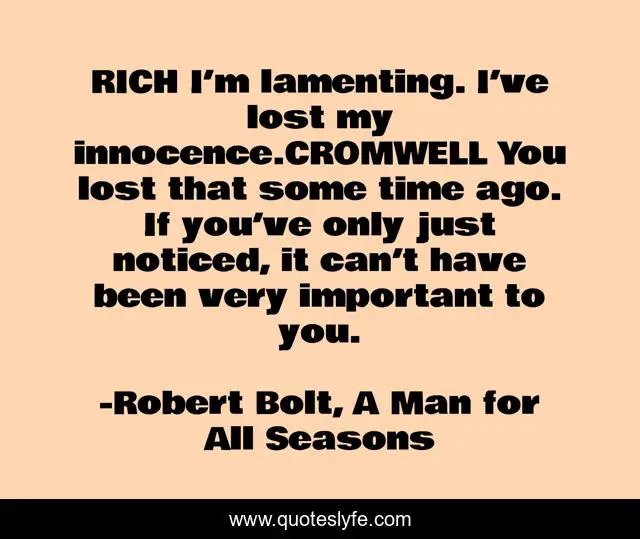 This page presents the quote "RICH I’m lamenting. I’ve lost my innocence.CROMWELL You lost that some time ago. If you’ve only just noticed, it can’t have been very important to you.". Author of this quote is Robert Bolt, A Man for All Seasons. .