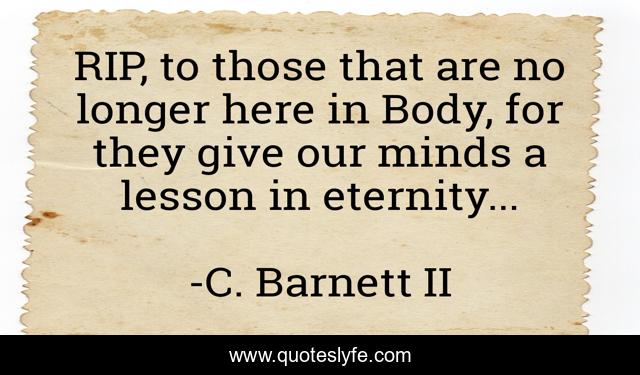 This page presents the quote "RIP, to those that are no longer here in Body, for they give our minds a lesson in eternity...". Author of this quote is C. Barnett II. This quote is about peace-of-mind, remembrance, death, peace,.