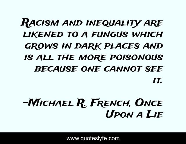 This page presents the quote "Racism and inequality are likened to a fungus which grows in dark places and is all the more poisonous because one cannot see it.". Author of this quote is Michael R. French, Once Upon a Lie. This quote is about dark, darkness, racism-fungus, quote-about-racism, fungus, inequality, injustice, pisonous,.