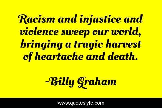This page presents the quote "Racism and injustice and violence sweep our world, bringing a tragic harvest of heartache and death.". Author of this quote is Billy Graham. This quote is about violence, harvest, racism,.