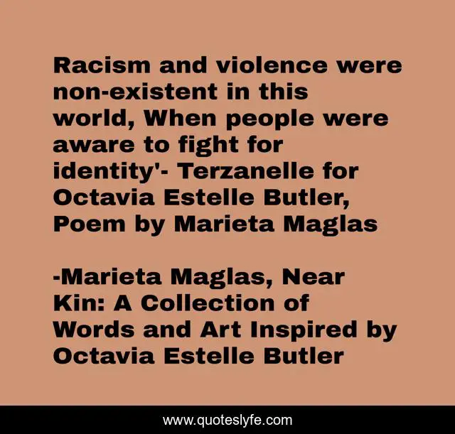 This page presents the quote "Racism and violence were non-existent in this world, When people were aware to fight for identity'- Terzanelle for Octavia Estelle Butler, Poem by Marieta Maglas". Author of this quote is Marieta Maglas, Near Kin: A Collection of Words and Art Inspired by Octavia Estelle Butler. This quote is about violence, racism, fight, identity, existence, world, awareness,.