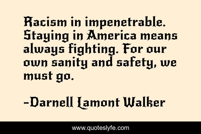 This page presents the quote "Racism in impenetrable. Staying in America means always fighting. For our own sanity and safety, we must go.". Author of this quote is Darnell Lamont Walker. This quote is about sanity, asylum, refugee, racism, supremacy, racist, safety, fear, america,.
