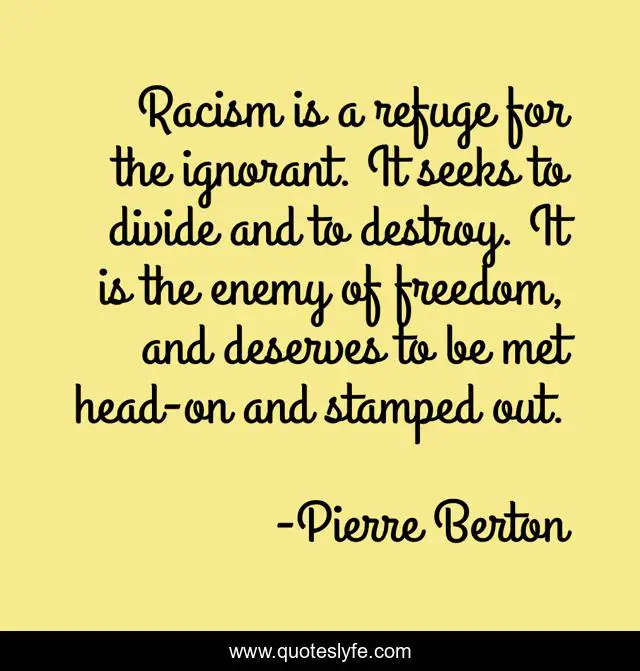 This page presents the quote "Racism is a refuge for the ignorant. It seeks to divide and to destroy. It is the enemy of freedom, and deserves to be met head-on and stamped out.". Author of this quote is Pierre Berton. This quote is about freedom, ignorance, racism,.