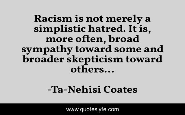 This page presents the quote "Racism is not merely a simplistic hatred. It is, more often, broad sympathy toward some and broader skepticism toward others...". Author of this quote is Ta-Nehisi Coates. This quote is about empathy-diversity, racism, contemporary-racism, empathy, prejudice, empathy-psychology, skepticism,.