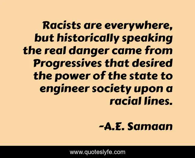 This page presents the quote "Racists are everywhere, but historically speaking the real danger came from Progressives that desired the power of the state to engineer society upon a racial lines.". Author of this quote is A.E. Samaan. This quote is about progressive, statism, racism, eugenics, progressivism, central-planning, scientific-racism, planned-societies,.