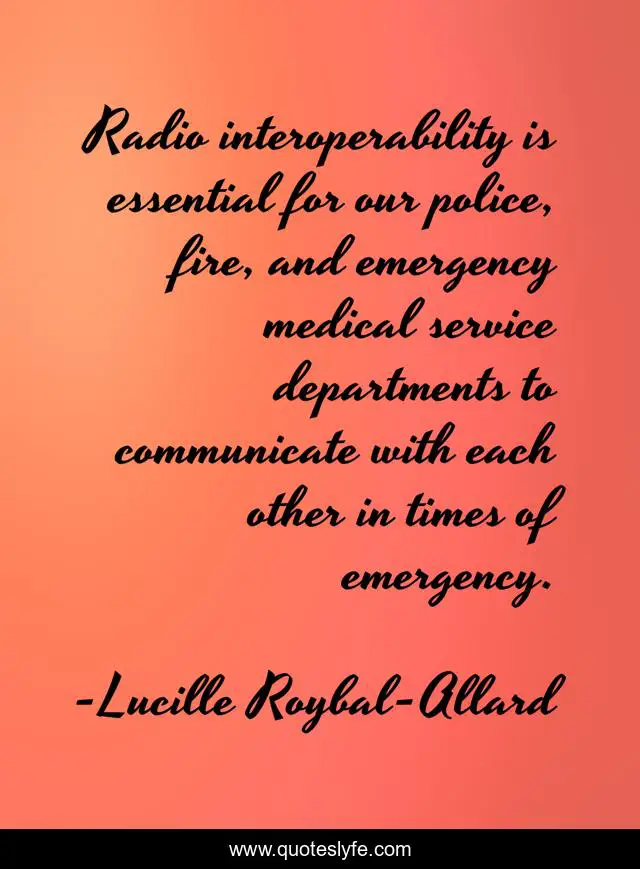 This page presents the quote "Radio interoperability is essential for our police, fire, and emergency medical service departments to communicate with each other in times of emergency.". Author of this quote is Lucille Roybal-Allard. This quote is about fire, police, service,.