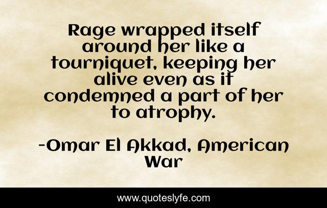 This page presents the quote "Rage wrapped itself around her like a tourniquet, keeping her alive even as it condemned a part of her to atrophy.". Author of this quote is Omar El Akkad, American War. This quote is about rage, war, revenge,.