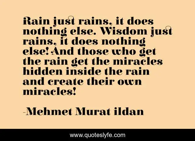This page presents the quote "Rain just rains, it does nothing else. Wisdom just rains, it does nothing else! And those who get the rain get the miracles hidden inside the rain and create their own miracles!". Author of this quote is Mehmet Murat ildan. .