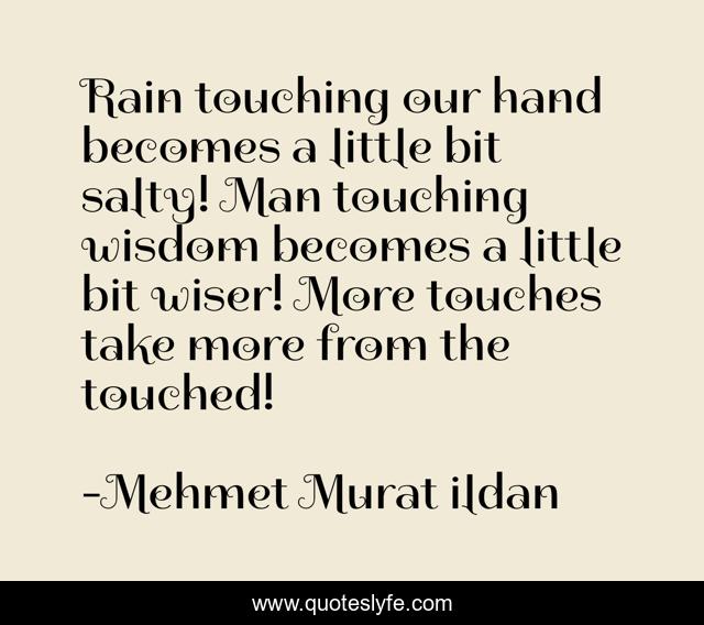 This page presents the quote "Rain touching our hand becomes a little bit salty! Man touching wisdom becomes a little bit wiser! More touches take more from the touched!". Author of this quote is Mehmet Murat ildan. This quote is about murat-ildan, rain, wisdom, touching, touched, turkish-literature, wiser, touch,.