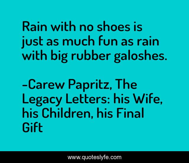 This page presents the quote "Rain with no shoes is just as much fun as rain with big rubber galoshes.". Author of this quote is Carew Papritz, The Legacy Letters: his Wife, his Children, his Final Gift. This quote is about shoes, carew-s, rain, galoshes, books, the-legacy-letters, carew-papritz,.