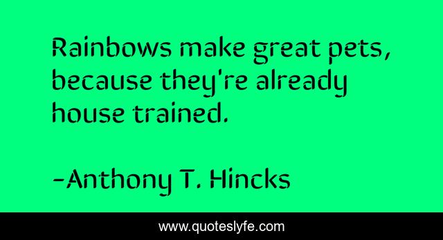 This page presents the quote "Rainbows make great pets, because they're already house trained.". Author of this quote is Anthony T. Hincks. This quote is about life, pets, color, house, colour, philosophy, trained, rainbows, make,.