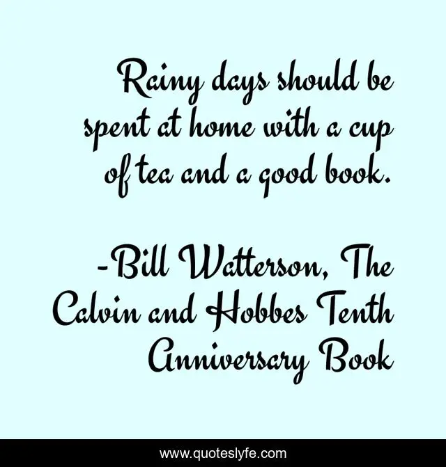 This page presents the quote "Rainy days should be spent at home with a cup of tea and a good book.". Author of this quote is Bill Watterson, The Calvin and Hobbes Tenth Anniversary Book. This quote is about tea, books, comfort, rain, reading,.