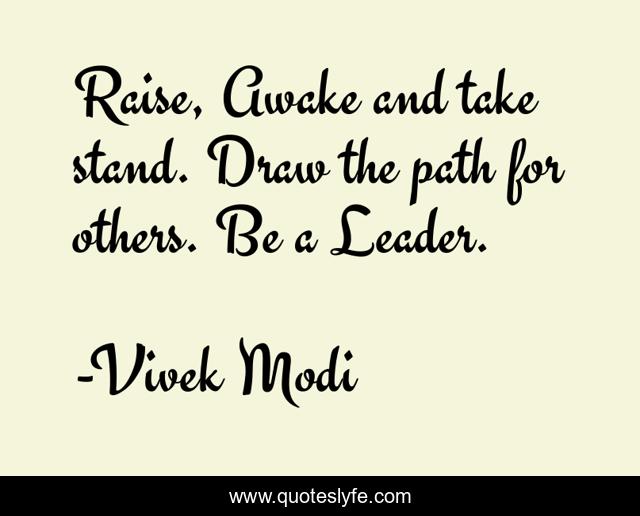 This page presents the quote "Raise, Awake and take stand. Draw the path for others. Be a Leader.". Author of this quote is Vivek Modi. This quote is about confidence, learning, positive, motivational, leadership, optimistic, inspirational, enthusiasm,.